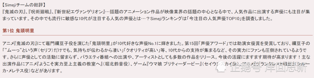 前三名分别是鬼头明里、梶裕贵和早见沙织,官方介绍第1名是扮演《鬼灭之刃》祢豆子的鬼头明里,第2名是扮演《进击的巨人》艾伦的梶裕贵,第3名是扮演《鬼灭之刃》蝴蝶忍的早见沙织。然后官方说说他们最近拿过什么奖,以及夸一下鬼头明里仅凭祢豆子“嗯”的台词就能表达角色的感情,实在非常厉害,夸一下早见沙织能发出蝴蝶忍绝妙且容易给人留下印象的声音的只有这个人,最后再补充一下他们在其他作品的角色。