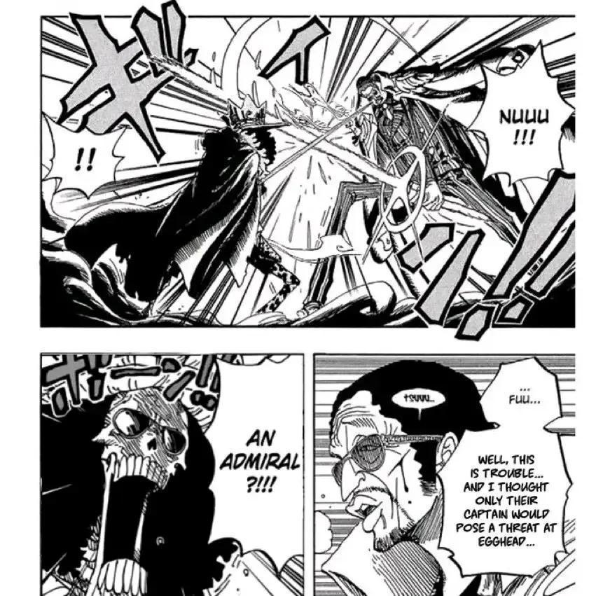 路奇与草帽小子打了一架,他并没有受到重伤,脸上只是贴了一个创可贴。路奇一点都不怕草帽小子,根本没有把草帽小子当成四皇。斯图西看路奇很恼怒,她知道路奇不会遵守海军的命令,海军要CP0按兵不动,等海军大将黄猿到来再开战。路奇想要马上进攻草帽一伙和贝加庞克,还大喊,我根本没有把草帽当成四皇。