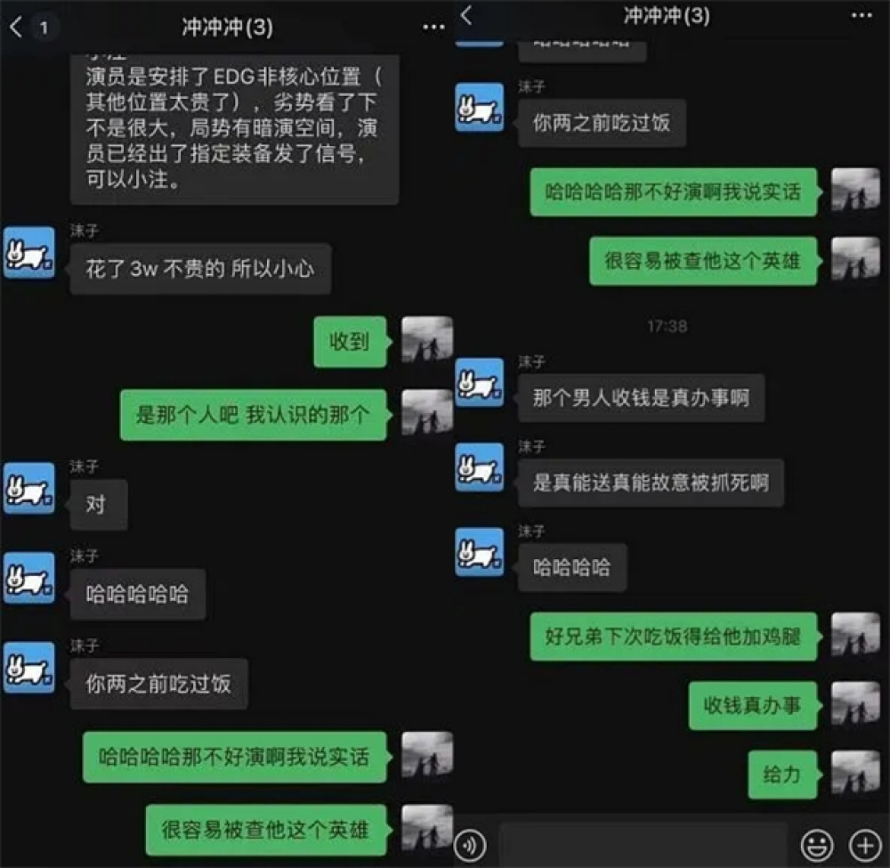 虽然没人吐槽MOJ选手,却有人质疑EDG二队里有“演员”。比赛结束后,有两张聊天截图突然爆出。内容是EDG战队被安排了“演员”,故意送输比赛。据悉,这人用的英雄很容易被查到。