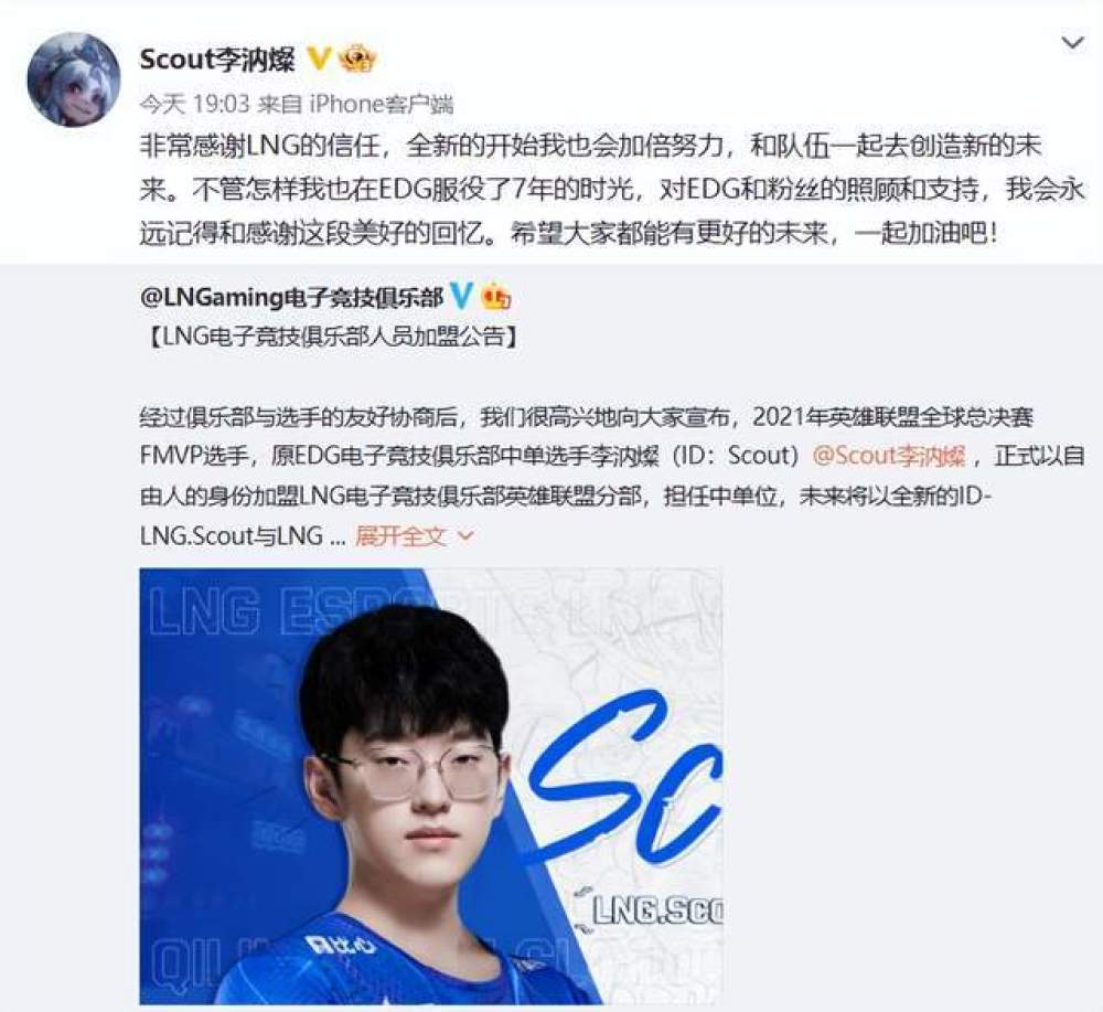 作为转会期极为抢手的选手之一,Scout被爆离开EDG后一时间让很多观众感到不可思议,不过当消息确定并且Scout被传出加盟LNG的消息,还是有很多人期待小学弟这位顶尖中单加盟后,LNG会产生怎样的化学反应。可是在转会期结束后,LNG却迟迟没有正式官宣Scout的加盟,直到12月进入尾声,于29日晚上LNG才正式公布Scout加盟的消息。