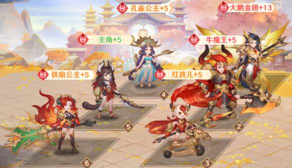 这套阵容大鹏金翅是核心输出,牛魔王、红孩儿可以对敌人造成灼烧,孔雀公主提供治疗,铁扇公主的技能可以延长灼烧效果持续的时间,并且还能够给全体成员回复怒气。