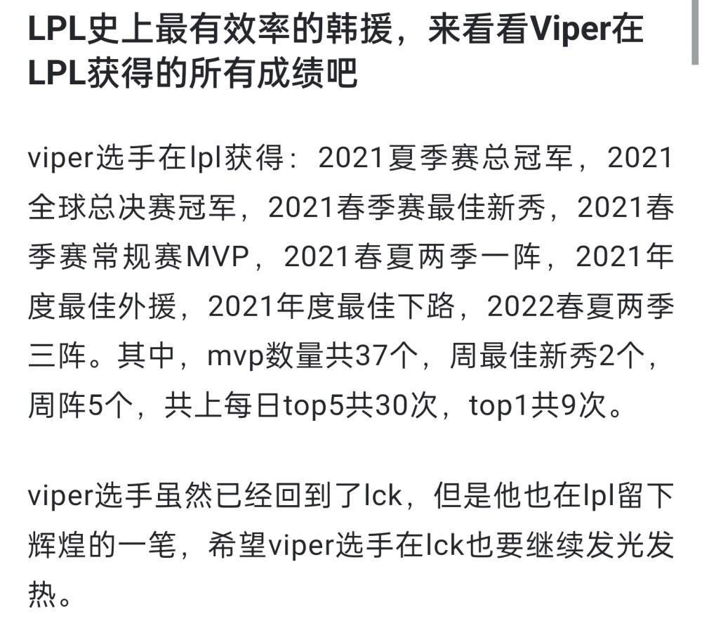 那么如果要说到这么多年过来,LPL赛区韩援最强的一位或者说是最给力的一位,到底是哪一名选手呢?相信很多观众朋友们都会提到Viper,当然并不是说这一名选手是总有韩援当中拿过冠军数量最多的,但是效率是绝对最高,Viper是在2020年12月冬季转会期加入的EDG战队,在2021年春季赛第一次登场的时候,在这个赛季取得了季军的成绩相对来说已经非常不错了,紧接着就获得了LPL 2021年夏季赛的总冠军,随后又获得了世界赛冠军。在EDG战队整整是打了两年的时间了,虽然说没有拿到太多的冠军,但是在这两年当中个人的表现绝对是非常出色的,各种MVP荣誉可谓是拿到手软。
