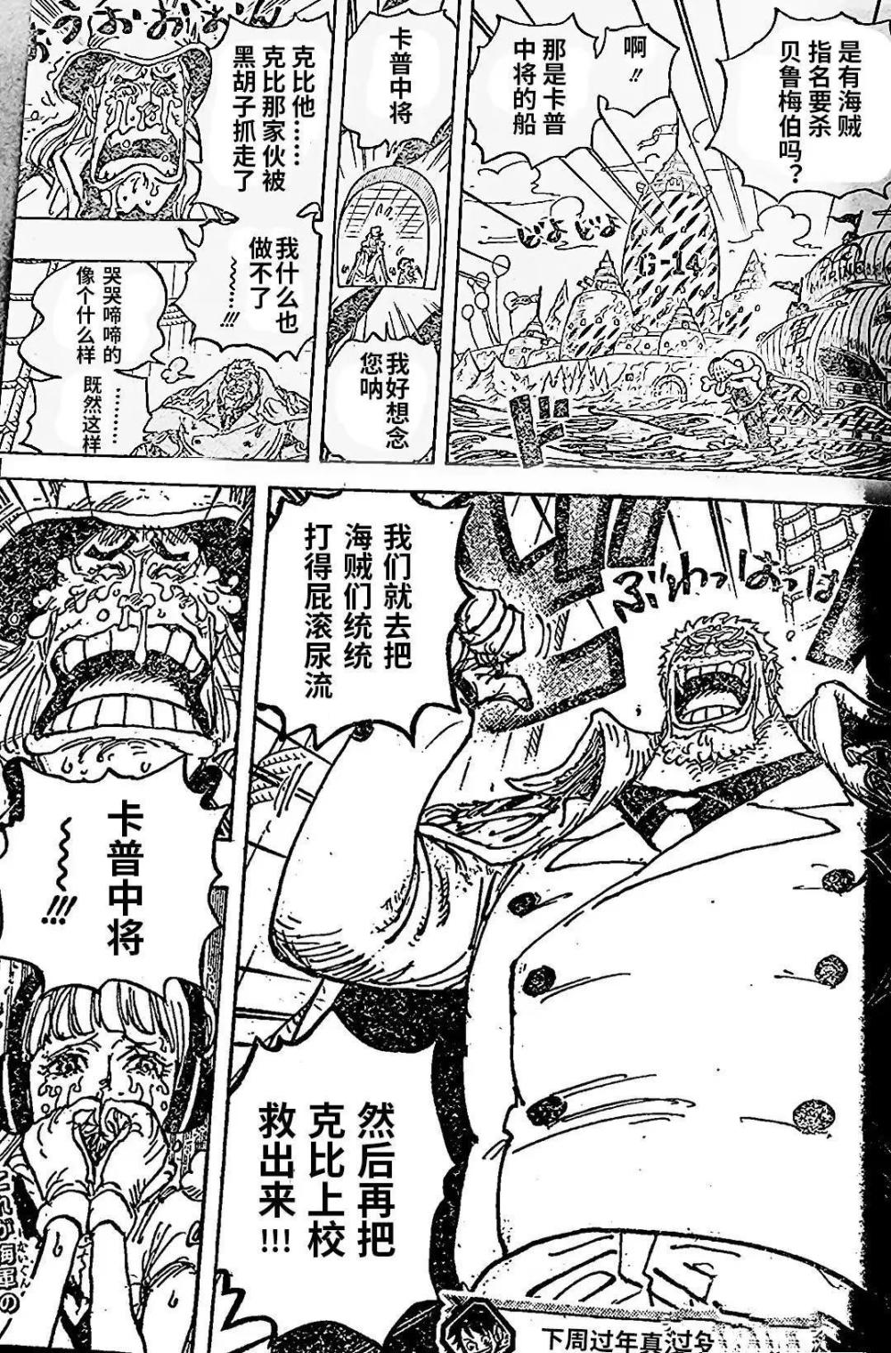卡普已经退休了,在海军本部也没有太大的话语权,即使他是海军英雄,军衔还是中将,多露中将不给卡普面子,她接到黄猿的命令,所有人前往未来岛阻拦草帽一伙。卡普也没有办法,他已经来到港口,贝鲁梅伯和云雀在港口上哭泣,卡普让他们上船,一起去揍飞黑胡子,救出克比。