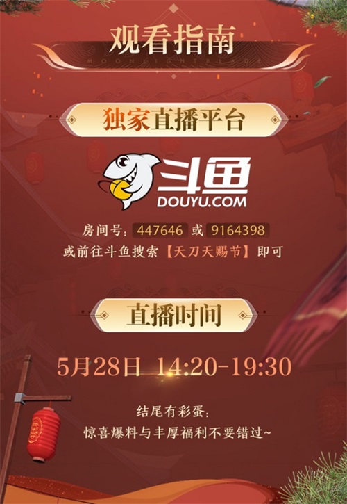 线下庆生宴于5月28日14:20起在斗鱼全程独家直播,届时少侠可前往斗鱼直播间观看,六重彩蛋、六重好礼等你来!更多精彩内容来跟刀妹一起康康吧~