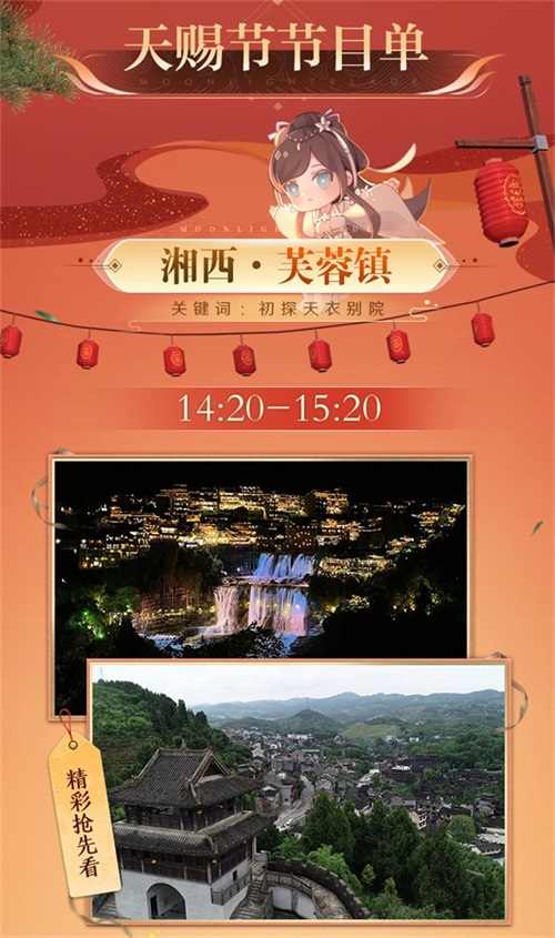 本次天赐节活动,刀妹将来到周庄,广州,芙蓉镇,成都,与少侠们一起赏山河风光,鉴中华民俗,送天涯豪礼~一手图透奉上,小小彩蛋就在图中,少侠们有没有发现呢?开播时间刀妹也已经为大家整理好啦,粗发!