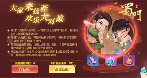 找茬大作战,上演火眼金睛对决!《蜀门手游》六一儿童节找茬对战即将开启,在一对一的比拼中,每位蜀友需与队友进行三轮对决,赢得轮数多者获胜。获胜者可赢得2星,平局则各得1星,失败或每轮找茬点数结为0则得不到星星。累积星数到一定程度,蜀友可获得找茬福袋,内含丰厚奖励!除此之外,累积星数排行榜前100名的玩家,还可获得找茬王者称号,以及捆仙锁等珍稀奖励!