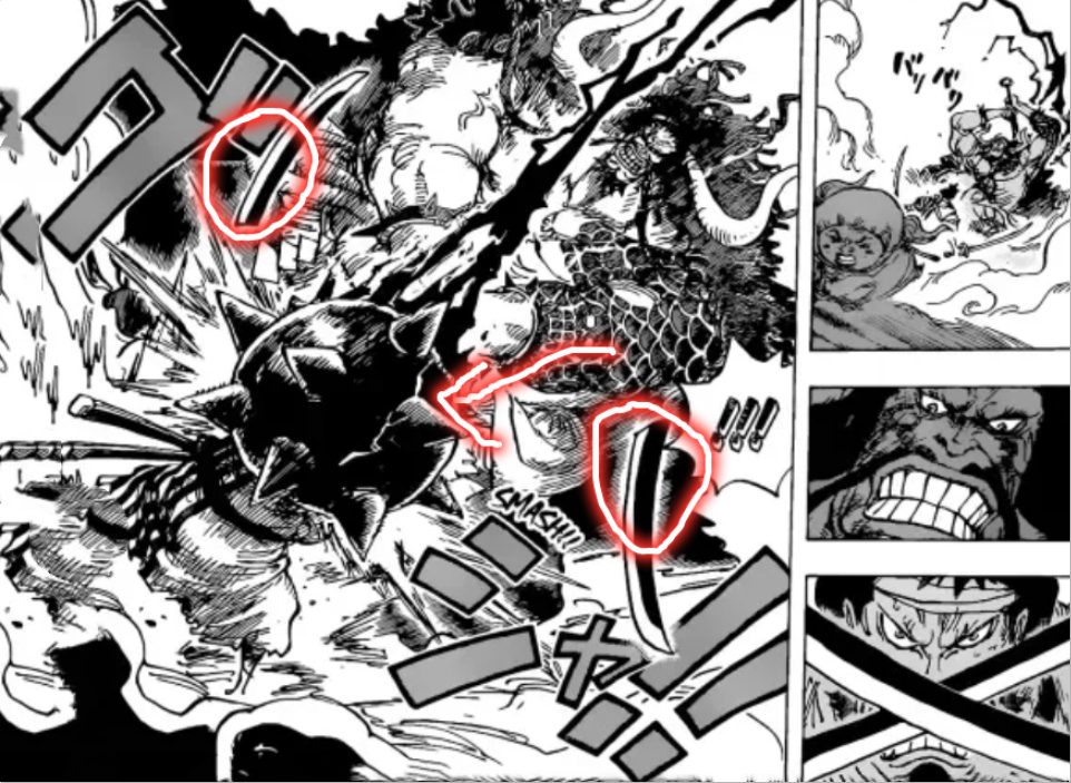 最后就是凯多暴击锦卫门的画面,由于这是1014话剧情收尾的一话。按照尾田老师的套路操作,一般情况下,首尾剧情都是悬念剧情,也就是说,锦卫门可能并没有被锤死。然而,这里还有两个细节,第一个细节是锦卫门的两把刀都被锤断了,这说明凯多很用力,所以刀才会被锤断;第二个细节是狼牙棒疑似出现了裂痕,这说明锦卫门也在认真防御。