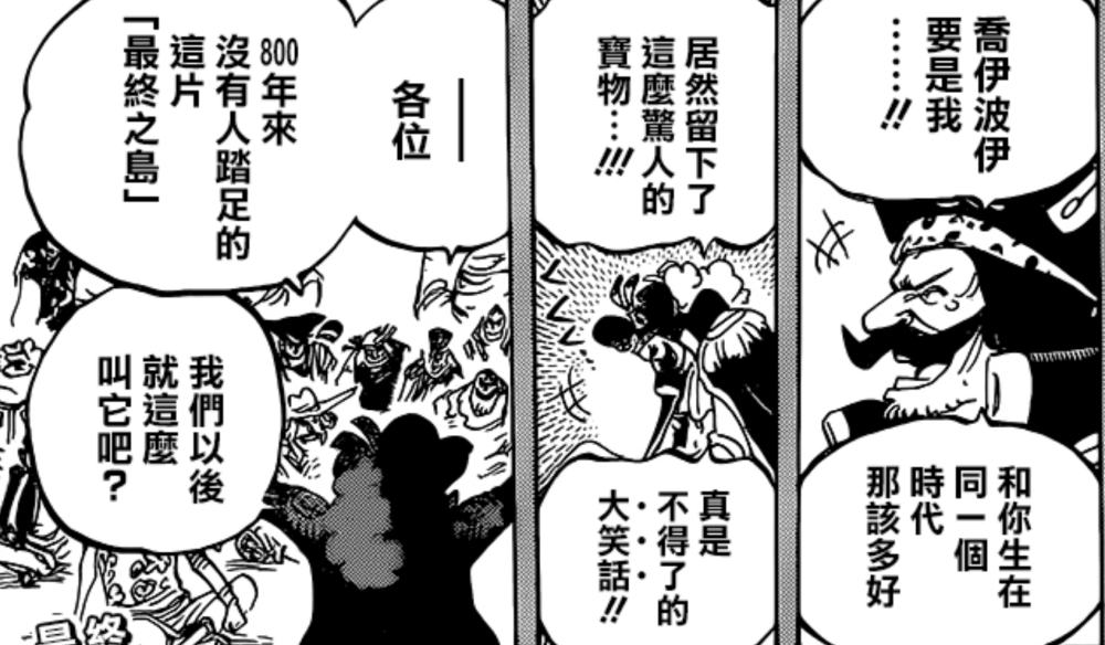 其次是上代海贼王罗杰在到达最终之岛后曾经感叹自己要是和乔伊波伊生存在同一时代该有多好。同时称所谓的“宝物”是不得了的笑话,但是什么?并没有交代。