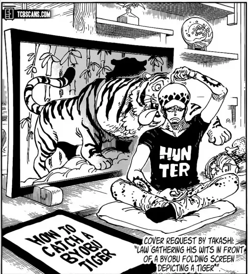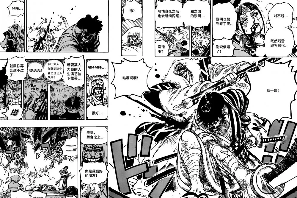 本话的主题名为:人生的蹩脚演员,说的应该就是勘十郎了。而这一次的扉页主角则是罗,这一次罗和老虎共处一室,不知道是不是说明罗的本命就是老虎,而他最后的对手莫非是藤虎,而这是否也侧面说明最后肯定不是草帽团一队独战海军?