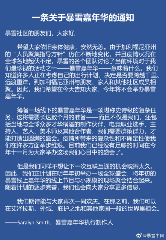 但是,今日凌晨,暴雪中国宣布将取消2021年暴雪嘉年华,而这场盛会将于2022年初在线上举办。