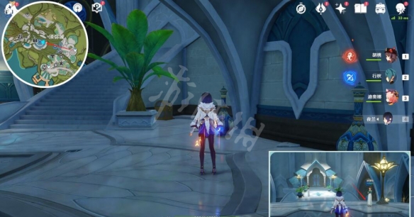 在须弥传送点,往上走,进入教令院,经过第一个房间的喷泉,即可看到一座桥,从npc「琪娜特」身后跳下去,就在npc脚下的楼梯盆栽旁边。