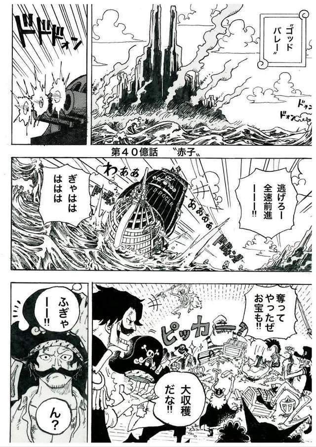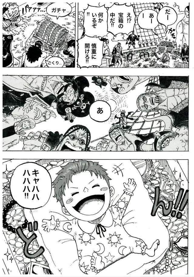 罗杰海贼团逃离神之谷,他们抢夺了很多财宝,这些财宝估计都是天龙人的,船员都在庆祝开宴会。罗杰听到财宝箱子里有婴儿的哭声,众人都惊呆了,全部人靠近了这个宝箱,贾巴打开箱子,发现里面有一个小婴儿。小婴儿非常开心,他躺在一张棉布上,罗杰海贼团所有人都露出不可思议的表情。