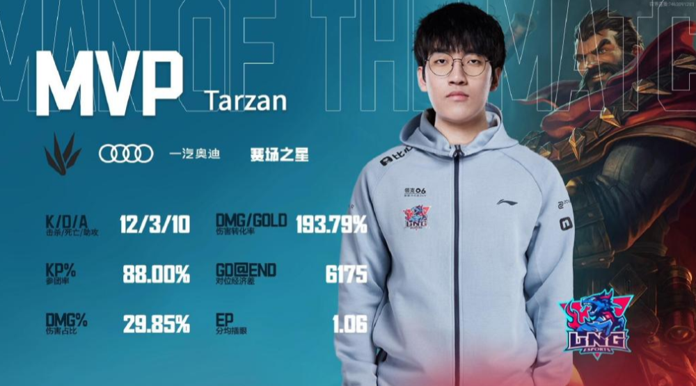 中路的话,LNG的Scout无疑是成为了这轮比赛的焦点选手。而在第一局中,Scout的沙皇就打出了“超神”的战绩,表现非常亮眼。不过在第二局与第三局中,Scout的表现只能够说是中规中矩。当然了,能够赢下比赛自然对Scout来讲算是开了一个好头。而他与LNG的磨合其实还是有待提升的。IGY的中单选手MG表现其实也还不错,特别是第二局的加里奥,在第一局被对手成功“超神”的情况下,依旧能够稳住心态帮助队伍扳回一局。