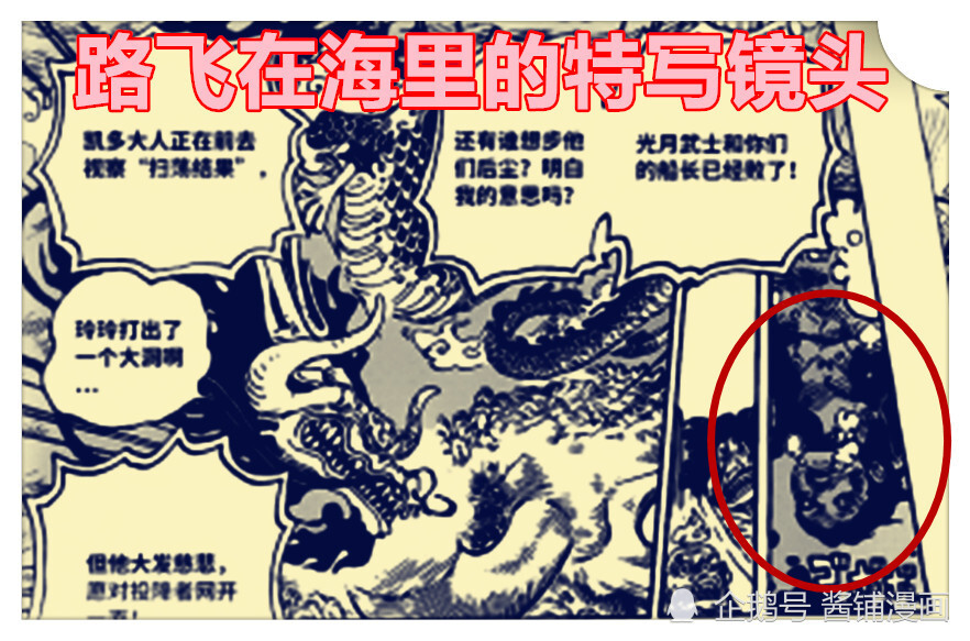 在最新的漫画中,有很多细节值得推敲,酱铺君觉得有几个方面,首先是路飞这边。尾田特地给了路飞掉落水面的五个特写,由远及近,以增加凯多与路飞战斗的激烈程度,生死攸关的紧张感,然而大伙都知道,路飞有光环,是不会挂的。