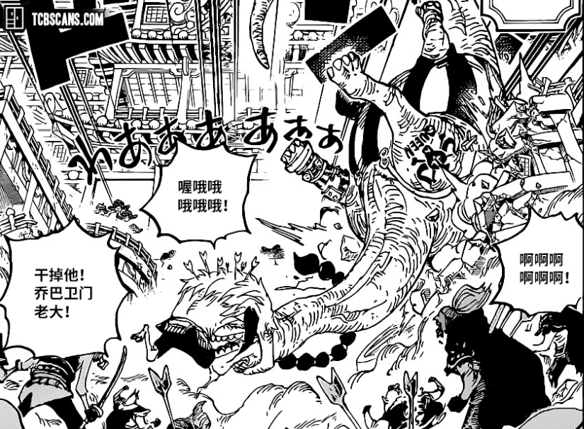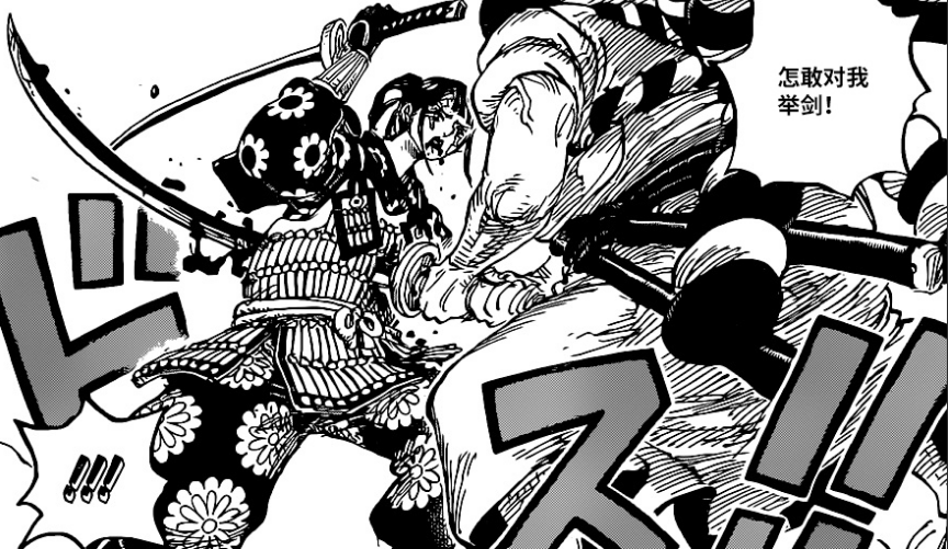这一话的开头就是路飞落下鬼之岛的画面,从凯多的话可以看出,即使掌握了霸王色缠绕,但在使用上,路飞是很难和凯多抗衡的,凯多还顺势吐槽了路飞的口头禅:还在那里橡胶橡胶个什么,从画面来看,路飞已经落入海中,而凯多最后的话也另有深意,他吐槽路飞也成不了乔伊波伊。