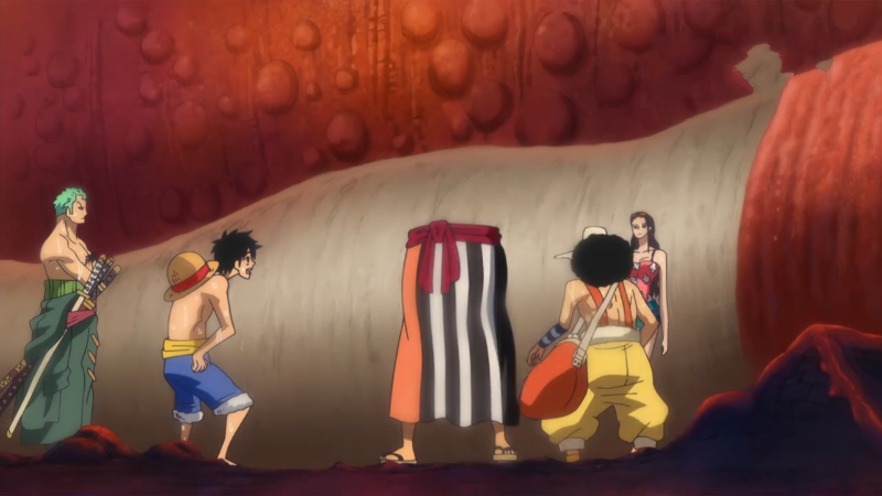 锦卫门在动漫中登场的画面还记得吗?没错就是在巨大龙身上的下半身武士,当初是被罗用刀给切了,好悲催啊!幸好遇到了路飞这群喜欢惹事的家伙,把巨大龙给砍了当肉吃,要不然锦卫门估计一辈子都在龙身上了。锦卫门后来的身体掉到河里了,是山治拼命给救回来拼好的,锦卫门甚是感动啊。