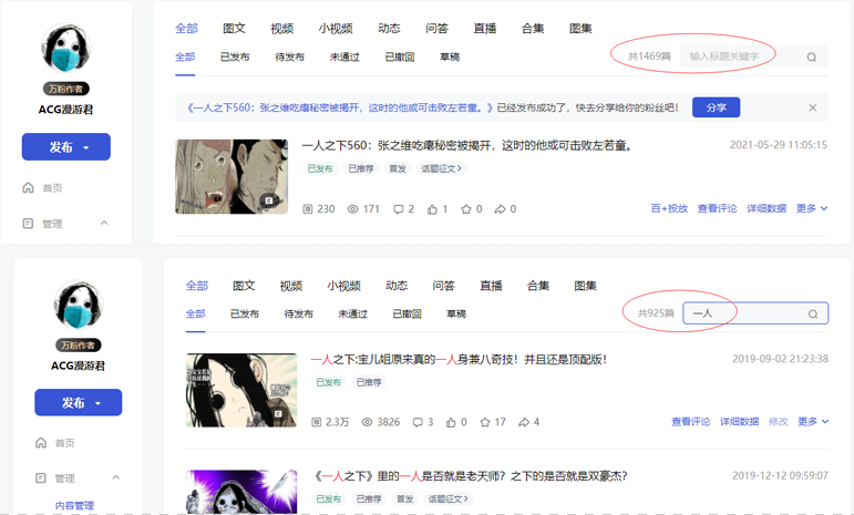 我于19年,问答文章数量1100左右的时候去了bd平台,然后开始发图文,我5.29搜索“一人”二字得出的数量为925篇,当然我《一人之下》的图文数量自然远不止如此,毕竟很多文章并没有带一人二字,为什么?因为标题被限制只能30字,“一人之下”四个字太占位置……所以你以为我最近排的序号是张口就来?我从1234开始排其实已经很保守了。