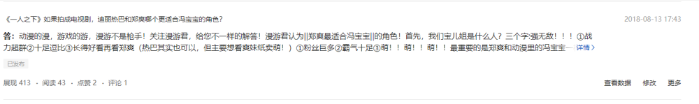 是一篇问答,回答的问题是“郑爽与迪丽热巴谁更适合冯宝宝的角色。”这是我前两天特意去翻的,那篇文章很短,大概只有两三百字,在网络上搜不到,毕竟某空问答已经下线了。