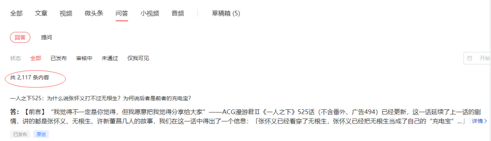 我做业余自媒体能混到今天,自己都感到唏嘘不已,毕竟算是不务正业了,而没想到的是我这不务正业一下子就不务了三年时间,18到19年初我一直只发问答,前两天翻了一下,我的问答数竟然有两千多篇,动漫文章中我其实写《海贼王》与《一人之下》最多,在这两千多篇文章中应该有300—500篇是写的《一人之下》。