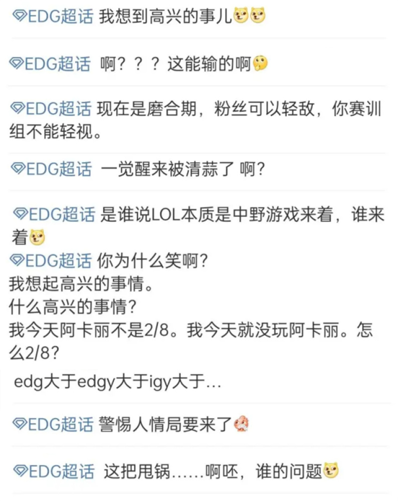 当然,EDG也不能高兴得太早了。我只能说他们跟LNG半斤八两,Scout和LP没达到大家的预期,一个中规中矩,一个被对手压制。而EDG最近训练赛打得也不好,fofo改id为“好好努力”,leave更是直言自己送输了训练赛,队友没指责什么反而原谅了他,心里很难受等等。