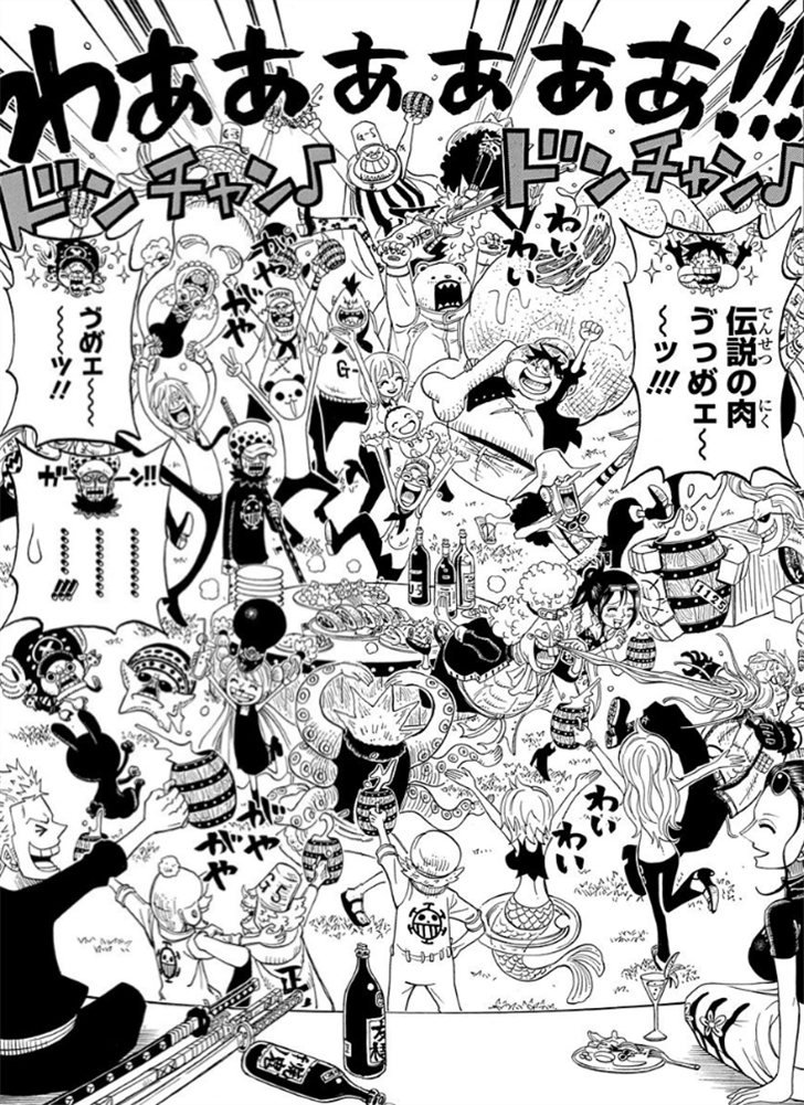 罗很无奈,草帽团就没有人好好管管路飞吗?乌索普表示路飞的任性程度媲美四皇,不可能有人能指示他做事(摊手)。最后罗也放弃了,表示自己不会和这样的路飞战斗,就这样这场最恶世代的战斗,还没有怎么开始就结束了。美味的传说之肉引发的这次战斗,最后以大宴会收场,毕竟路飞最喜欢开宴会了,大家一起享用才是最开心的。