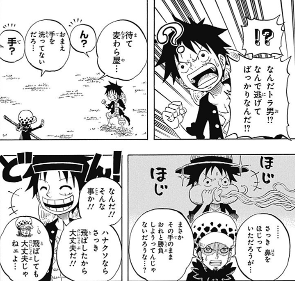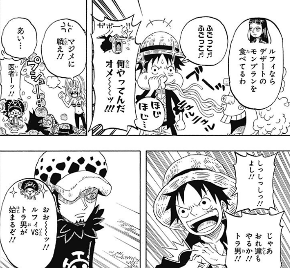 罗直接发动「Room」,路飞的各种都被罗给躲开了,完全没有要和路飞战斗的想法,只是一味地躲闪。路飞很生气,这样的战斗不是他想要的,于是开始质问罗为什么只会逃走。罗给出了一个竟然咋舌的理由,那就是路飞他邋遢了,他才不想和抠鼻没有洗手的人战斗,索隆表示很赞同,跟Mr.5战斗时他就是和罗一样的心情。路飞倒是不在意,布鲁克还调侃乔巴只要吃下就这团东西就会变大,实在太好玩了。