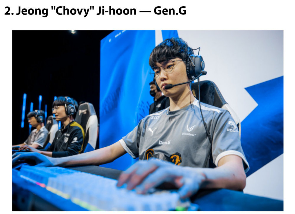 排名第一的是Faker,这个排名多少还是有些给李哥面子,从2022年的收获来看,T1拿了春季赛冠军、MSI季中赛亚军、夏季赛亚军、S12亚军,但这都是整个团队的贡献!现在在团队里面,Faker都属于发育团队型,在世界赛上TOP表现出彩指数也不是很高!不过从全年综合表现,Faker入选到这份名单还是实至名归的!而排名第二的则是GEN的中单Chovy,在2022LCK夏季赛他C了整个赛季,但在S赛的时候却没有打出大家所期望的表现,如果从各项数据来看,不管是KDA还是补兵经济,超威排在前二也还是有道理的!