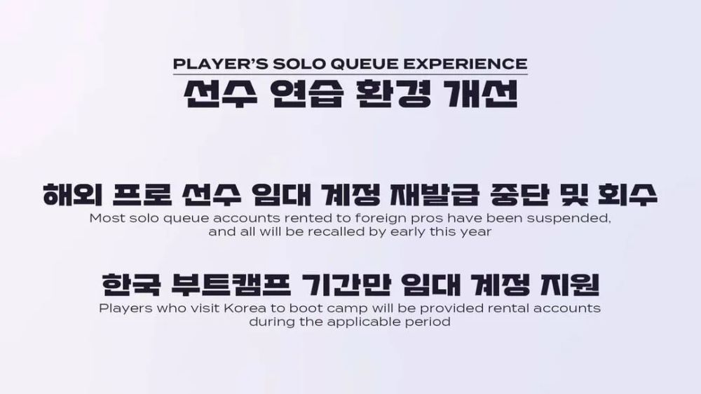 而在今天,LCK官方正式宣布,为了改善LCK赛区选手的排位训练环境,将暂停海外职业选手的韩服超级账号租赁服务。大多数的租给外国职业选手的单排账号都被暂停使用,将在2023年第一季度全部召回账号,LCK仅会为在韩国参加集训的选手提供租借账号。