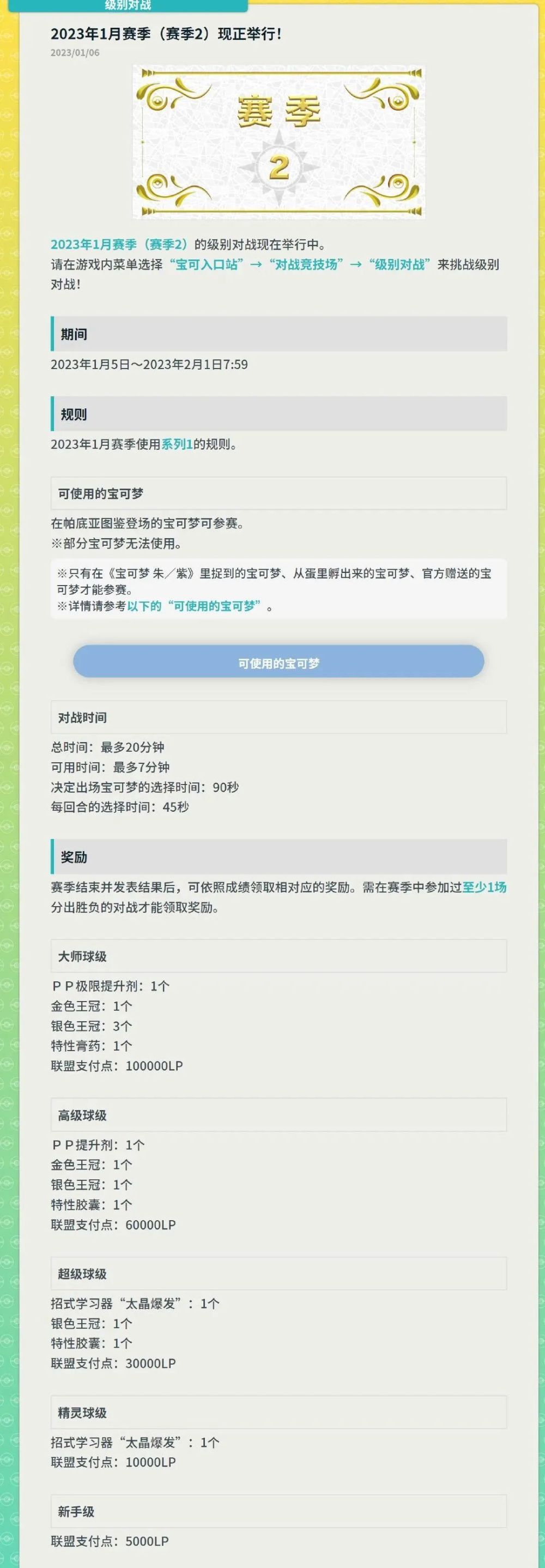 《宝可梦朱紫》2023年1月赛季(赛季2)的级别对战现在举行中,各级别奖励有所更改,大师球级奖励有特性膏药和PP极限提升剂,具体请看图1。