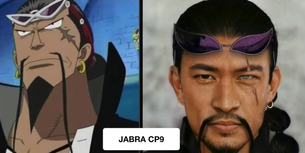 加布拉的实力是CP9中排得上号的,脸上的长伤疤和细长的胡须是他的面目特征,AI版本下的他看起来像某个国内的演员,不过原作中加布拉的伤疤在眼睛下边,怎么作者将伤疤放错了地方,并且还让加布拉的左眼失色,估计是作者弄错了原有的细节设定,或者是自己加入的创新。