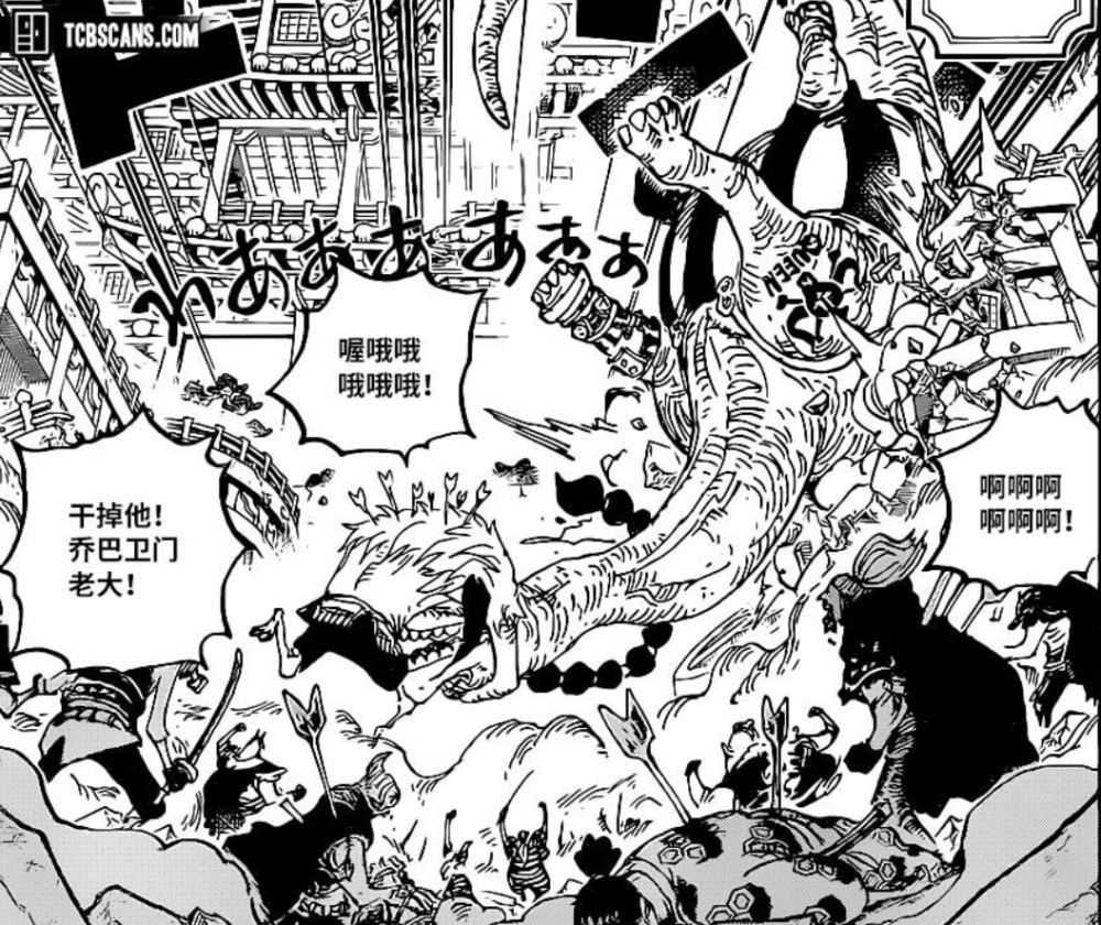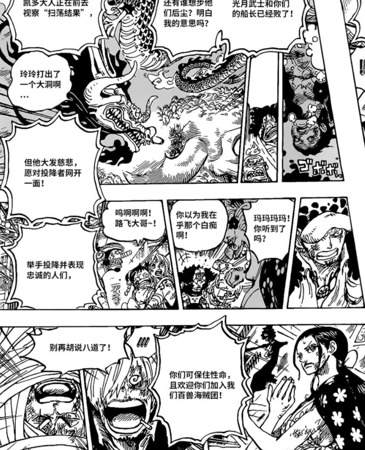 开话第一章凯多嘲讽路飞虽然学会了流樱但是却不熟练,还表示出招时的招式还花里胡哨的,特别是凯多的这句“还在那橡胶橡胶个什么?”实在是满满的嘲讽啊。接着凯多部下联系凯多已找到桃之助的位置,凯多表示马上过去并命令部下向鬼岛广播此时路飞战败的消息。