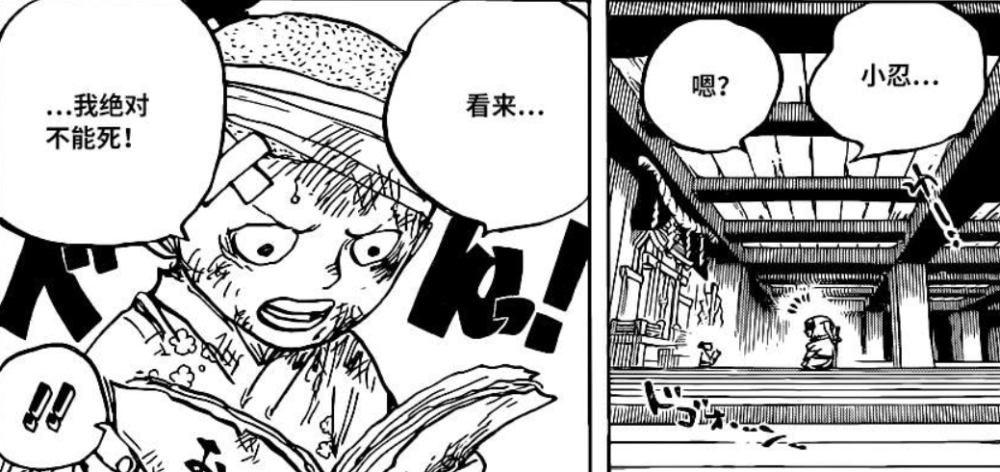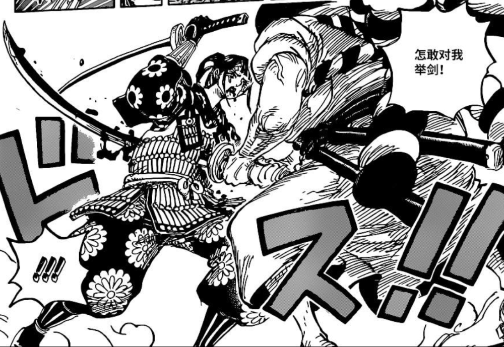 勘十郎来到桃之助位置,并化身光月御田的模样还想故技重施,但是却被小菊当面拆穿,当小菊持刀砍去时却因为是勘十郎化身御田的模样而下不去手,勘十郎趁机拿刀刺穿了小菊的腹部,小菊看是凉凉了,锦卫门见状直接出刀砍死了勘十郎,而此时的凯多已来到桃之助的位置,锦卫门示意小忍带着桃之助快走,自己却硬抗了凯多的正面攻击。