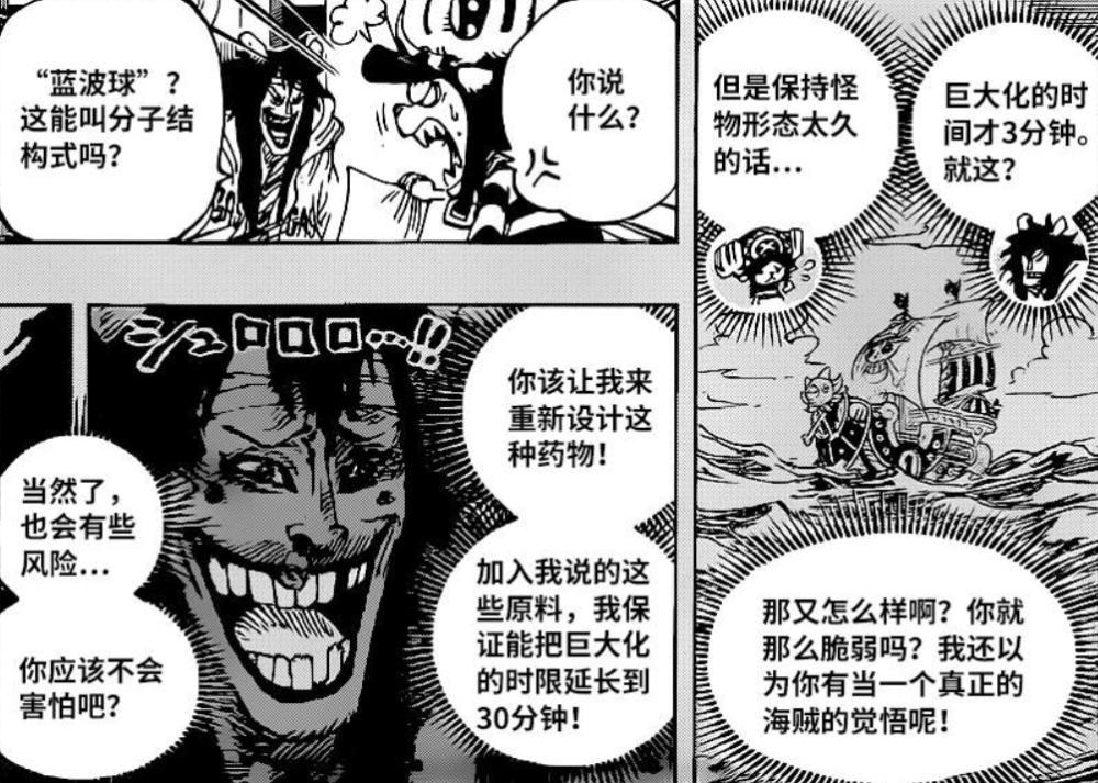 乔巴变成巨大化对战着奎因和佩罗德,画面中可以清楚地看到乔巴的背后身中好几箭佩罗德的“糖果箭雨”但是还是抡起奎因猛摔,但是这些攻击似乎对于奎因不管有,奎因还甚至嘲讽了起来,此时的乔巴已经在喘大气了,回想起凯撒帮自己改造的“新蓝波球”可以让巨大化维持30分钟但是会有负荷,此时的乔巴应该顾不了那么多了就是上。
