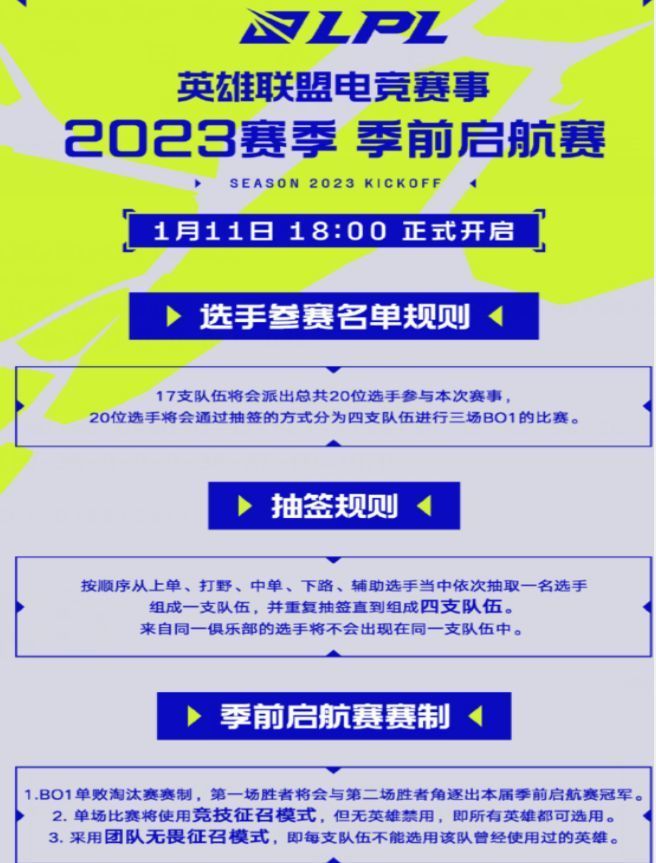 LPL赛区的参赛时间是在1月11日的晚上6点正式举行,一直持续到9点,为期3小时的直播活动,其中,LPL赛区的17支队伍将会派出一共20位选手来参加本次赛事,届时这20位选手将会通过抽签的方式分为四支队伍进行三场Bo1比赛,跟上面的赛事规则一样,大家可以使用所有英雄,但每支队伍不能使用该队伍曾经使用过的英雄。