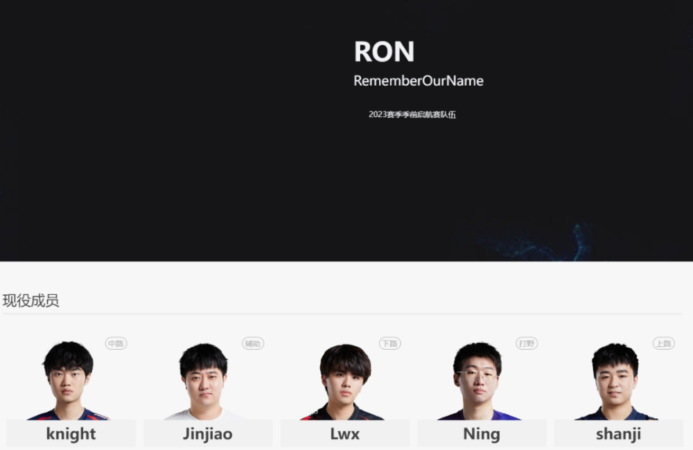 RON这支队伍的中野是knight与Ning的前YM中野,值得一提的是,这也是宁王回归之后首次在正式比赛中亮相,而宁王的实力恢复到了几成,相信在季前启航赛中会为我们带来一些答案。除了前YM的中野之外,上路位置的是超级新人shanji。而双人路则是LWX与Jinjiao这对LPL老将的组合。