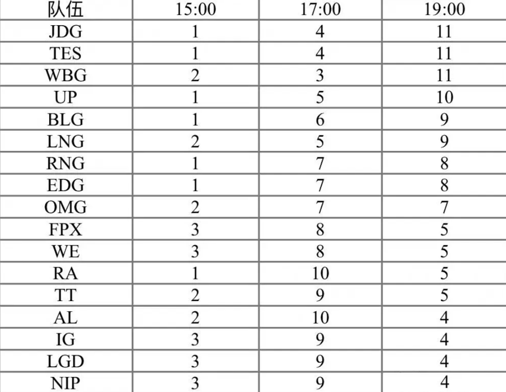 具体赛程安排如下图所示,其中19点比赛最多的是JDG、TES和WBG,都是11场,而JDG和TES分别只有1场比赛安排在下路15点,所以可以看出,官方把JDG和TES的比赛,大部分都安排在黄金档,WBG的关注度也很高,只不过15点的比赛多了一场。而人气第四名的战队有点让人意外,UP有10场比赛是在19点,5场比赛在17点,只有1场比赛在15点,看来UP买来了前冠军选手Ning和宝蓝之后,也是受到了LPL官方的重视,看好他们的人气。