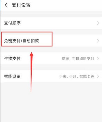 2.在设置中找到支付设置,然后通过支付设置看到“免密支付/自动扣款”选项;