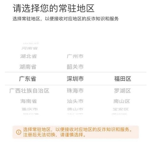 2.成功进入国家反诈中心app后,选择用户常驻的地区,这里需要注意的是常驻地区一旦确认是无法更改的;