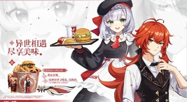 该活动于3月8日开启,活动开始的当天KFC门店就涌入了大量的原神迷,纷纷购买原神套餐,还会喊出一句“异世相遇尽享美味”;