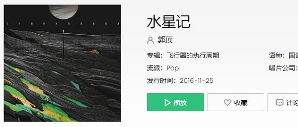 这首歌是由郭顶演唱的《水星记》,所属专辑:《飞行器的执行周期》,发行时间:2016-11-25。