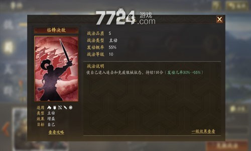 具体的效果方面为:连击和免缴械状态持续一个回合,这个战法还是比较不错的。