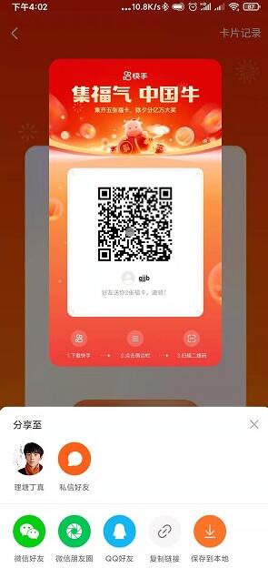 3.又或者是分享至快手好友,选择一种方式后复制分享口令,将分享口令通过以上的途径发送给好友,好友通过口令进入到快手中就能领取福卡了;