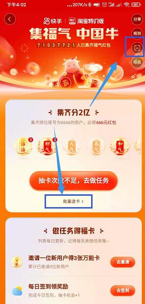 4.还一种方式就是通过抽卡的下方的“批量送卡”将玩家重复数量最高的福卡赠送给好友,同样是上面的多种方式,将对应的二维码或口令复制给好友;