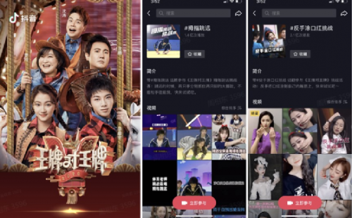不仅如此,在抖音上综艺内容创作者已经累计达22万,较去年增长146.09%;累计投稿超49万+,较去年增长204%。众多优质的内容创作者的二创内容,也进一步提升了节目的影响力。在《王牌对王牌》播出期间,节目组曾与抖音联动推出#反手涂口红挑战 及#拇指跳远 等大热挑战赛,撬动了众多明星达人、抖音创作者、素人用户参与互动和内容创作中。各类相关创作视频收获3.5亿次播放,为节目赢得了更大声量和更多抖音综艺用户关注。