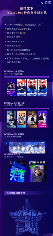 此外,抖音通过多个自创IP,为明星的宣发营销带来更多可能。2020年,抖音以“抖音美好奇妙夜”加速明星多面展示自我、以“抖音娱乐黑马计划”助力新生代艺人出圈,在疫情期间更打造DOULIVE娱乐直播厂牌。数据显示,“DOULIVE”吸引超过123位明星“入厂”,直播累计播放超2.3亿次,累计曝光超26亿。这些IP的叠加,加速了明星在抖音上的“破圈”。