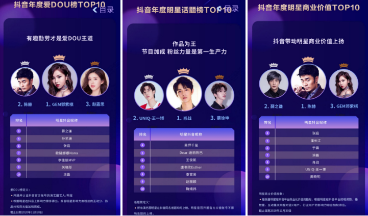 此外,白皮书更以抖音站内用户数据作为主要依据,评选出“抖音明星爱DOU榜年度TOP10”、“抖音明星话题榜年度TOP10”、“抖音年度商业价值TOP10”三大榜单,邓紫棋、肖战、陈赫分别位居榜首,分别成为2020年抖音上最具影响力/话题度/商业价值的艺人。其中,抖音明星影响力由粉丝的互动分、热度分和荧光值加和而成,抖音商业价值指数则由明星在抖音平台的视频数、播放量、互动量及明星对蓝V用户、行业用户的影响力加权得出。由此可知,艺人在抖音的影响力和商业价值跟自身运营抖音账号的能力密切相关。