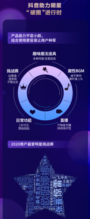 海量的关注明星内容的用户,促使抖音成为助力明星“破圈”宣发的重要阵地。而抖音也通过“趣味魔法道具”、“魔性BGM”、“直播”、“日常功能”、“挑战赛”等自身产品的组合使用,让抖音站内的明星宣发变得更有趣。其中,“明星挑战赛”最受抖音用户欢迎。白皮书总结了2020用户最爱明星挑战赛,其中包括“欧阳娜娜 惊雷”、“张晋 一飞冲天”、“肖战变身失败”等,这些挑战赛吸引众多抖音用户围观、参与,助力明星跨圈层吸粉。