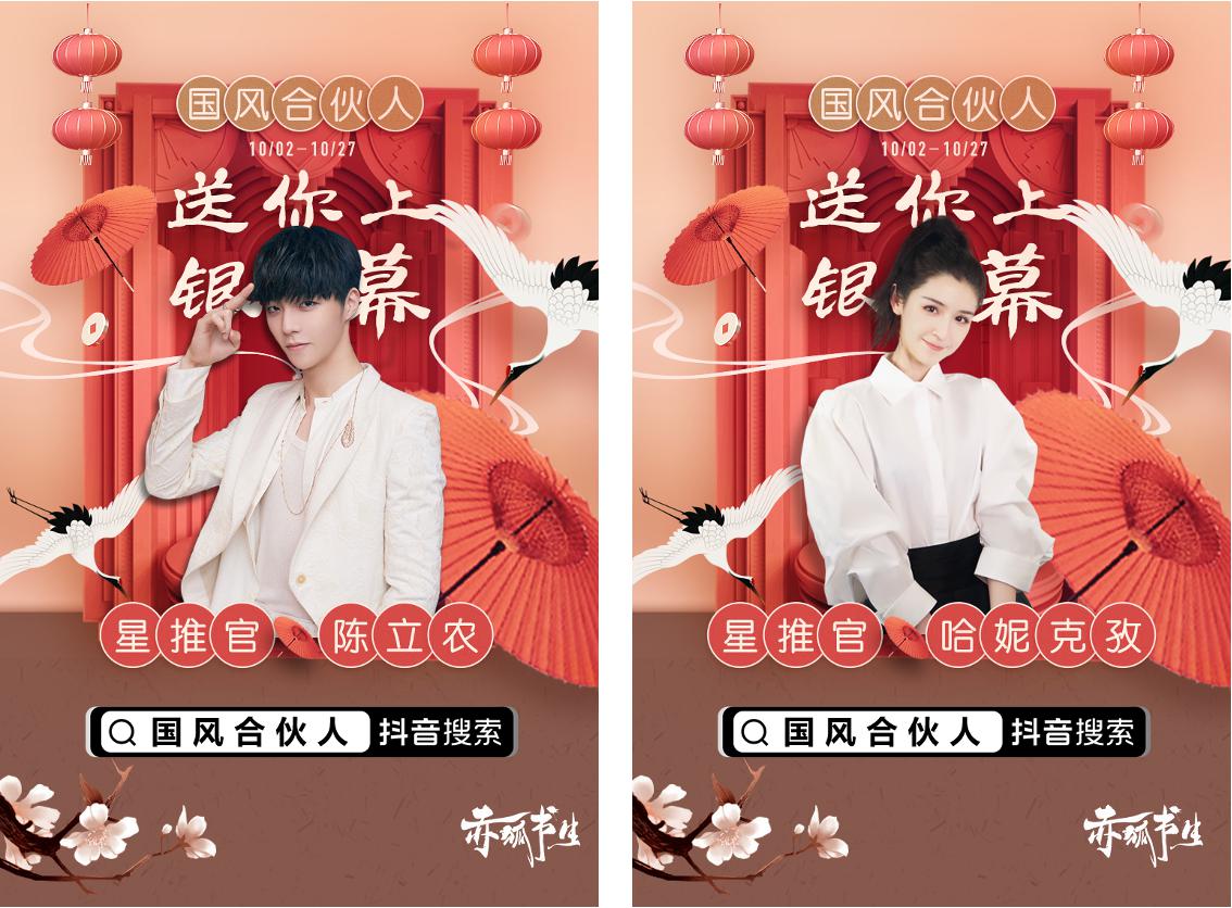 10月2日至10月27日,抖音二次元发起“国风合伙人”征集活动,通过征集国风二次元短视频,为国风爱好者提供展示平台,最终征集到的符合活动规则的原创短视频将被抖音制作成为千人国风大片,在11月22日汉服出行日当天解锁全国最多11座城市的22家影院同期上映。抖音邀请陈立农和哈妮克孜担任国风合伙人星推官,两人还将携手李现一同加盟助阵,与网友共舞国风。