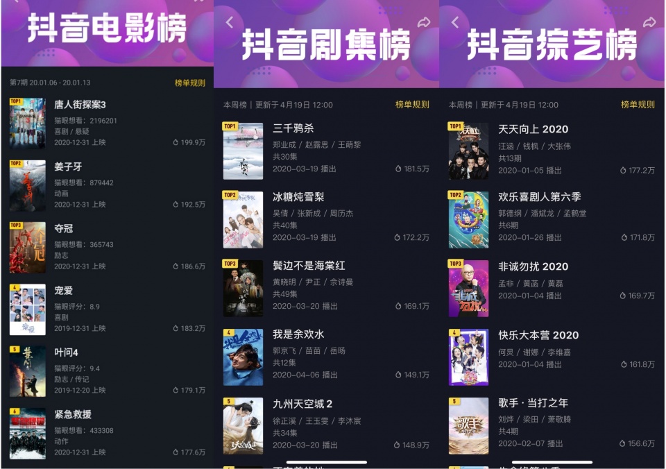 此次上线的抖音热度榜,每日12点更新当周影视项目热度数据,通过排行榜直观展现电影、剧集、综艺在抖音平台的一周热度值及排名。如在截止到4月19日的当周热度榜中,《三千鸦杀》《天天向上2020》《鬼吹灯之龙岭迷窟》分别占据抖音剧集、综艺、电影榜首。
