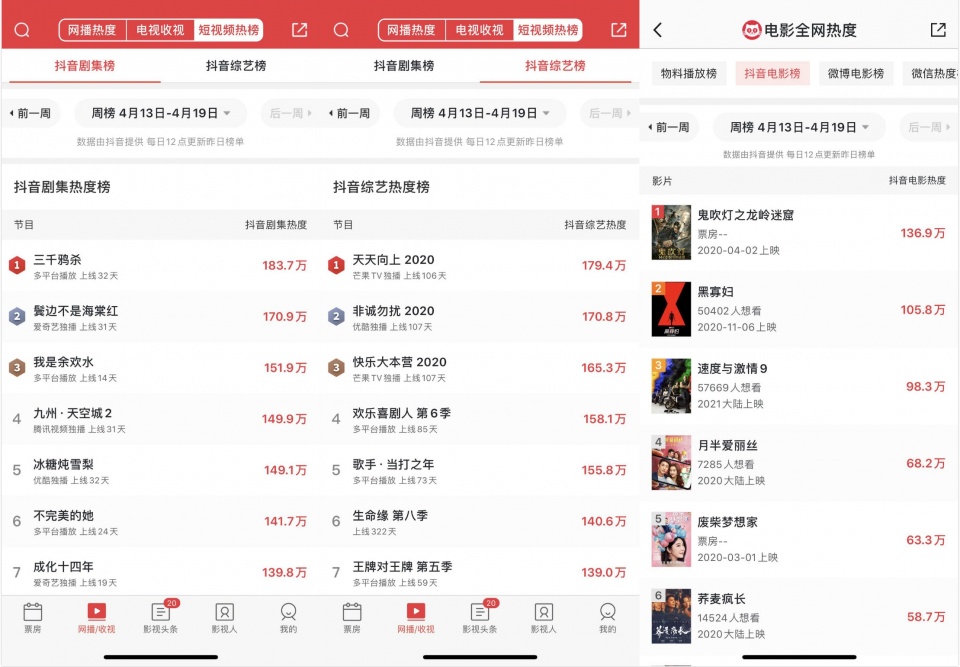 4月18日,猫眼专业版App发布更新版本,上线数据服务新功能——抖音热度榜,成为抖音在影视综领域的首家数据合作平台。目前,该榜单包含抖音剧集榜、抖音综艺榜、抖音电影榜,由影视项目在抖音平台的官方账号影响力、影片讨论度、话题指数和搜索指数加和而成的热度值排名。